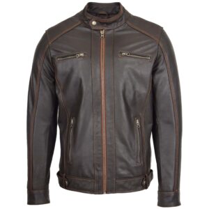 Mens Real Leather Biker Style Zip Jacket Classic Cafe Racer Ethan Brown