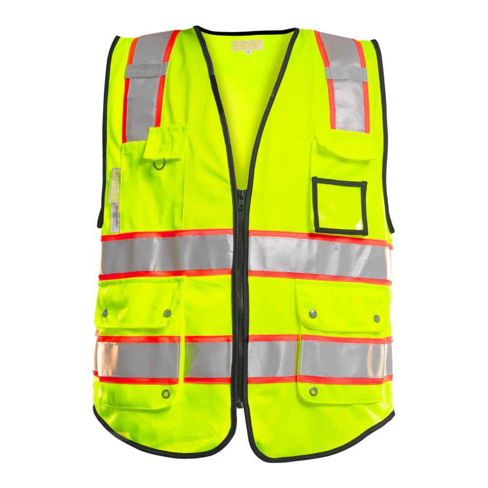 Keep radios, notepads, markers, or gloves close at hand. The layout matches the images you see: pockets up front, ID window on the right chest, and wide reflective bands across the body.