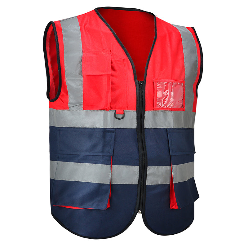 The fabric is 100% polyester knit. It is light, durable, and easy to care for. The vest weight is 120 GSM, so it layers well over a tee, hoodie, or jacket. The zipper front makes on and off quick between tasks. Dual colors (Red/Navy Blue and Yellow/Navy Blue) give a clean, pro look for teams, visitors, and supervisors.