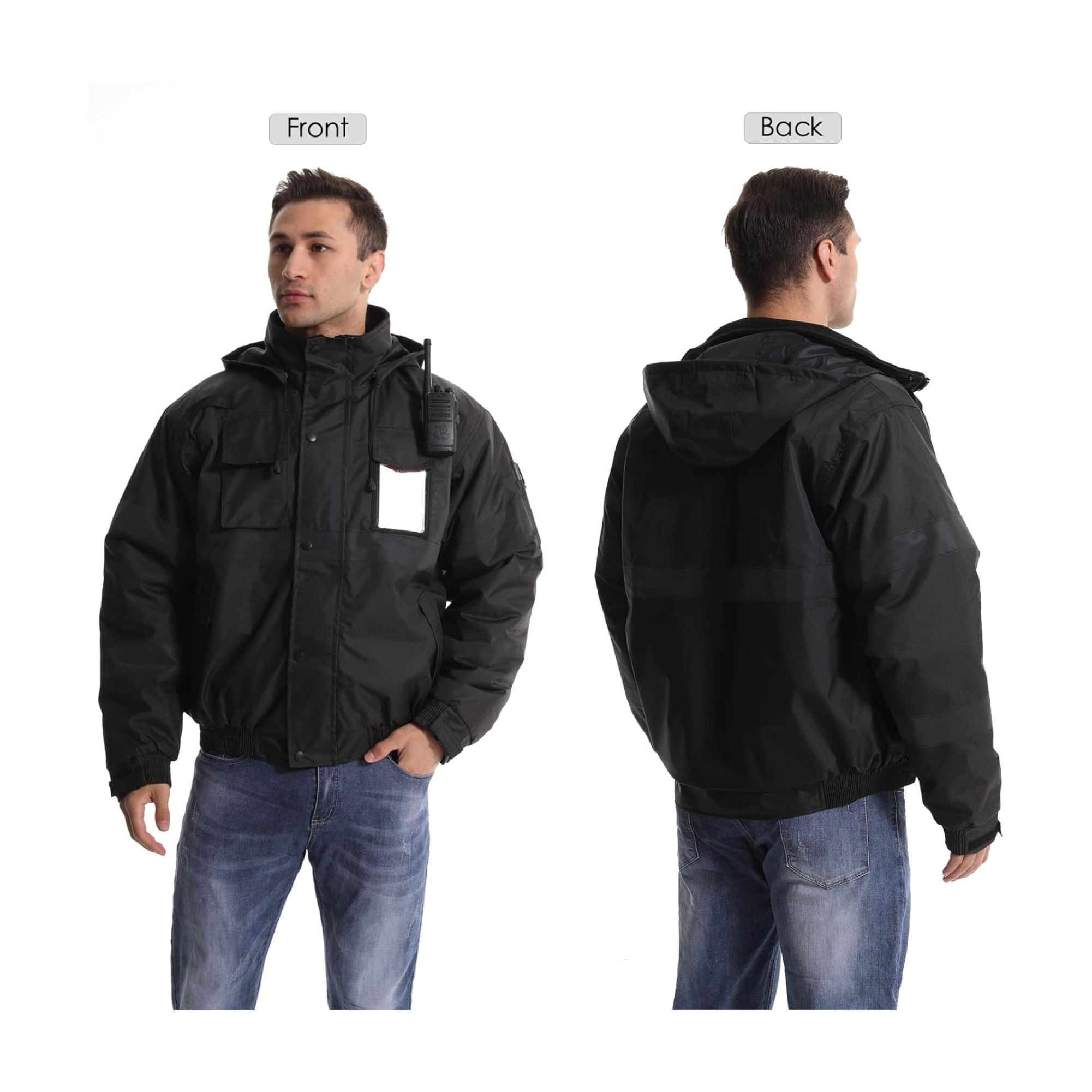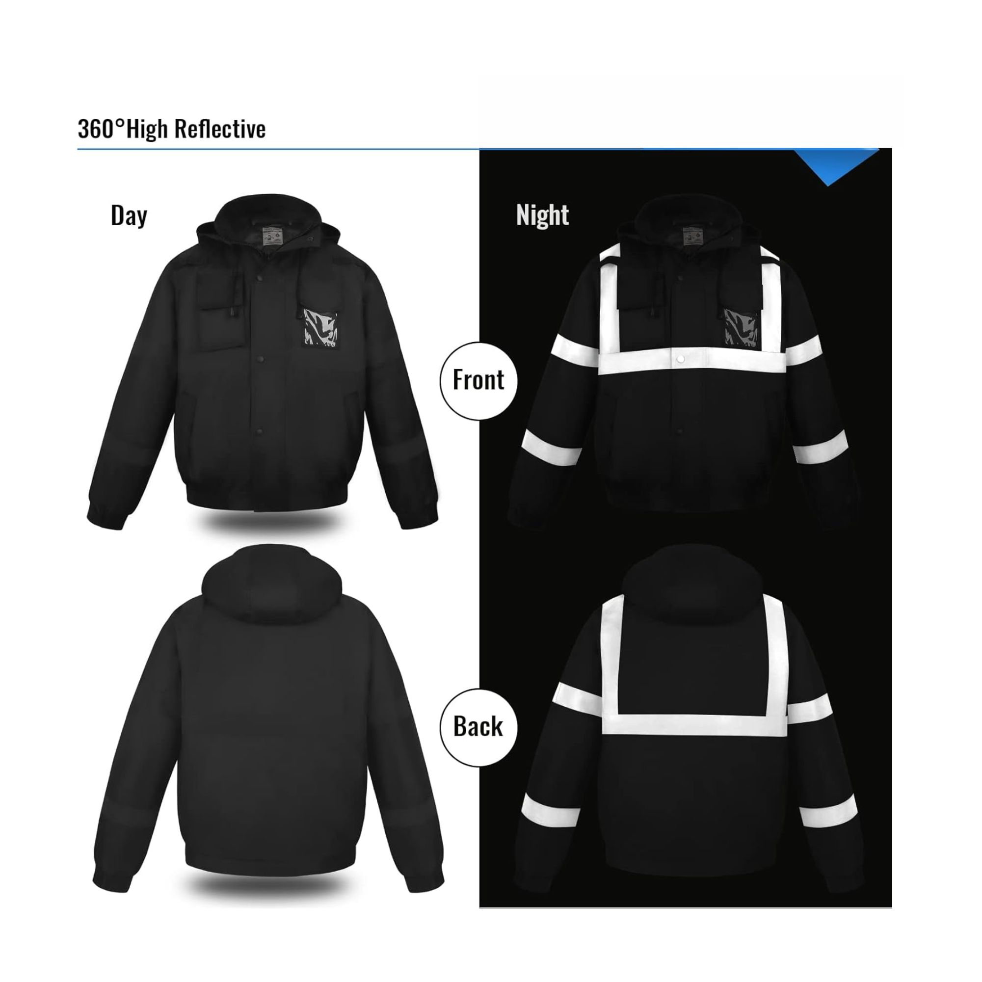 High Visibility Reflective Jackets for Men, Waterproof Safety Jacket for Men with Pockets, Black Work Construction Coats for Winter Cold Weather,3XL, 1 Pack. Black shell with wide reflective bands for 360° shine. Waterproof protection, warm lining, zip front with storm flap, removable hood, chest ID window, and roomy hand pockets. Built for cold job sites.