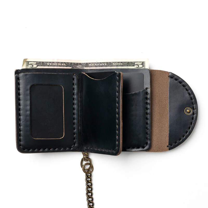 Hand-sewn with heavy-duty polyester thread, this wallet promises long-lasting durability. It includes 3 card slots, a wide middle pouch for additional cards, and an ID slot that flips open for quick access. The billfold keeps your cash secure, and the snap button enclosure ensures everything stays in place. The detachable 12″ brass chain adds a bold, functional element, making it easy to attach to your belt. With dimensions of 3.25″ x 4″ x 0.4″, the Leather Biker Wallet is the perfect size for front-pocket carry. As always, it comes with a lifetime guarantee.