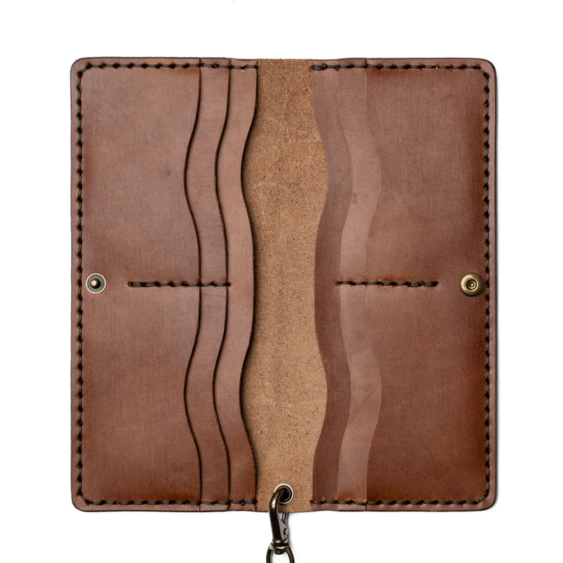 The Leather Long Wallet by Dedo Leather Crafts combines practicality with style. Crafted from full-grain leather, it holds unfolded bills, multiple cards, and even a checkbook. Featuring a detachable brass chain for easy access, this wallet is built to last and improves with age, offering both durability and functionality.