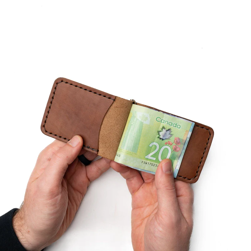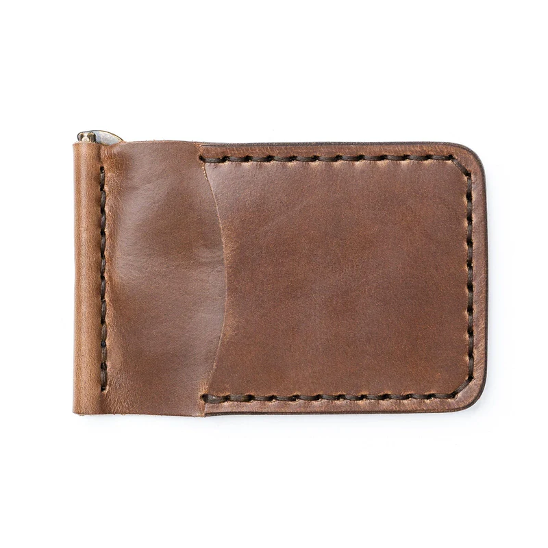 The Leather Money Clip Wallet by Dedo Leather Crafts is a slim, stylish wallet that holds both cash and cards securely. Featuring a solid brass spring bar clip for bills, this full-grain leather wallet also includes 4 card slots and a minimalist design, making it perfect for front-pocket carry.