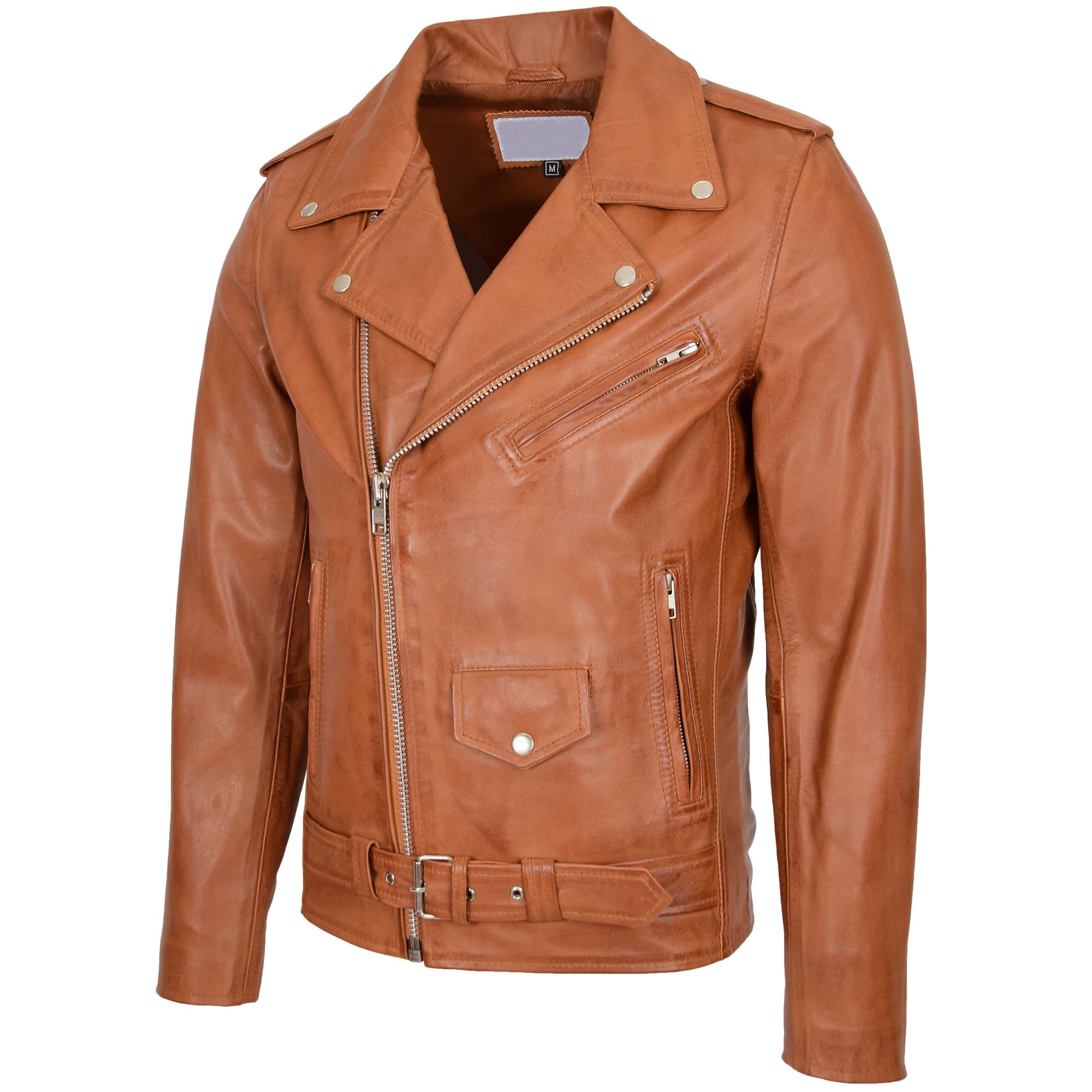 The jacket shows a warm tan shade with a smooth finish. The cross-zip layout forms a true Brando biker shape. Metal studs lift the front design. The angled chest pocket adds detail. The lower pockets sit neat on the body. The waist belt gives a firm and stylish look. The Men’s Leather Biker Jacket Brando Style Johnny Dynamo Tan blends classic moto style with a bright modern color.