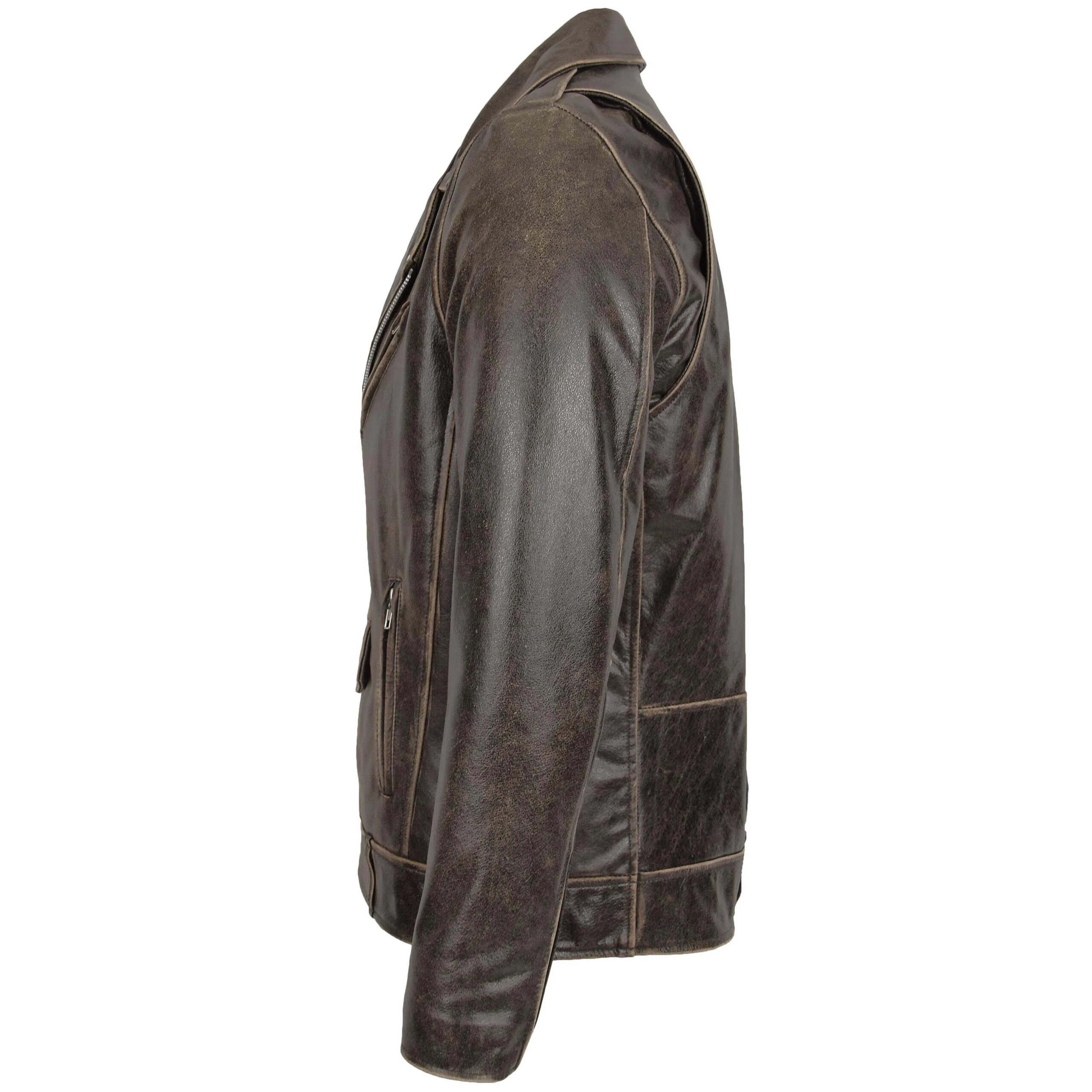 The Men’s Motorcycle Biker Vintage Distressed Brown Real Leather Jacket brings a classic aged biker style with a cross zip, slanted chest pocket, and metal snaps. The worn seams give a vintage touch. Dedo Weather Works makes the jacket soft inside and strong outside for rides and casual use.