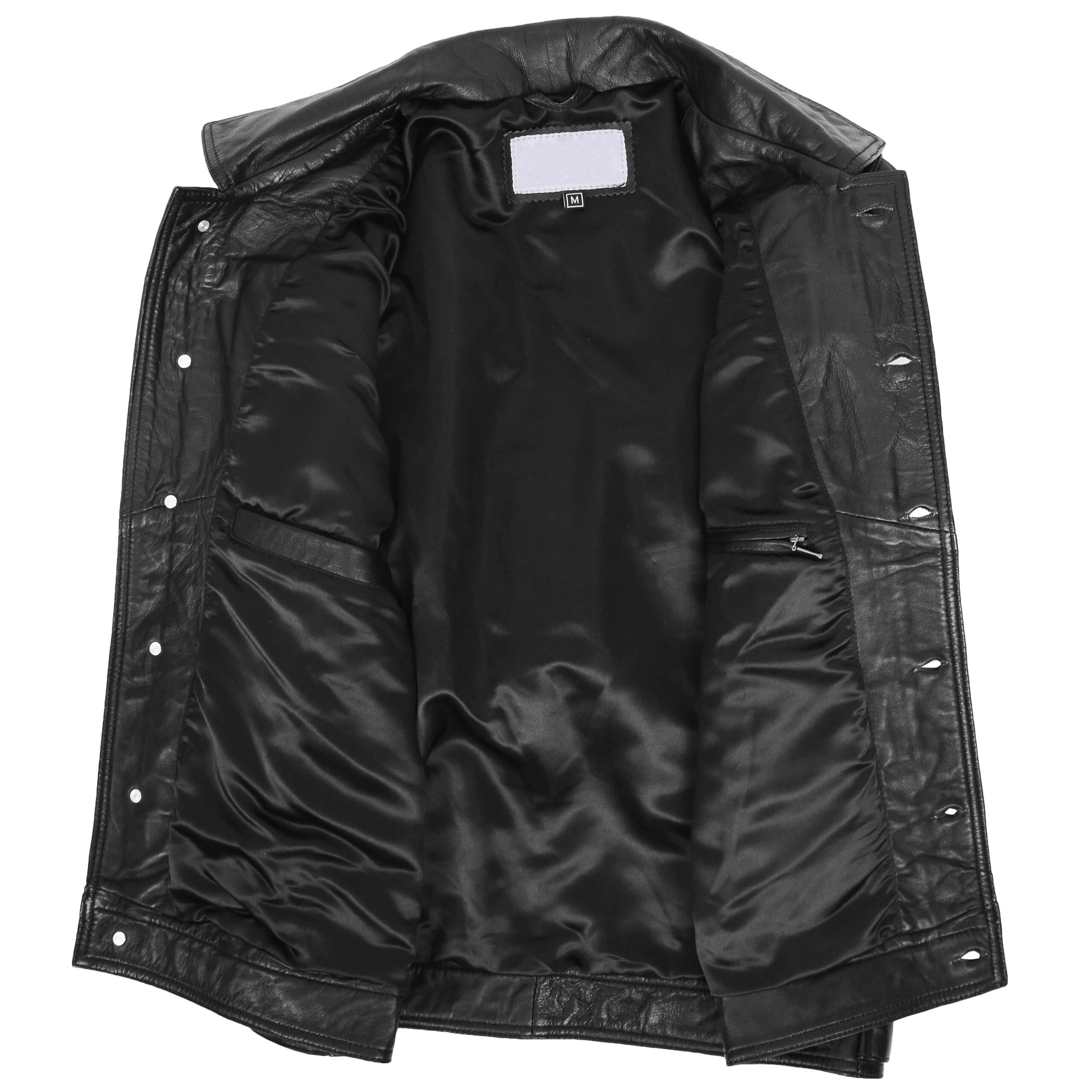 The Mens Real Leather Trucker Jacket Lee Rider Style Terry carries a clean trucker layout with a bold rider touch. The chest flap pockets give the front a balanced and strong look. The center zip keeps the shape simple and modern. The straight shoulder and sleeve panel lines add structure and sharp detail. The jacket holds a classic yet updated style.