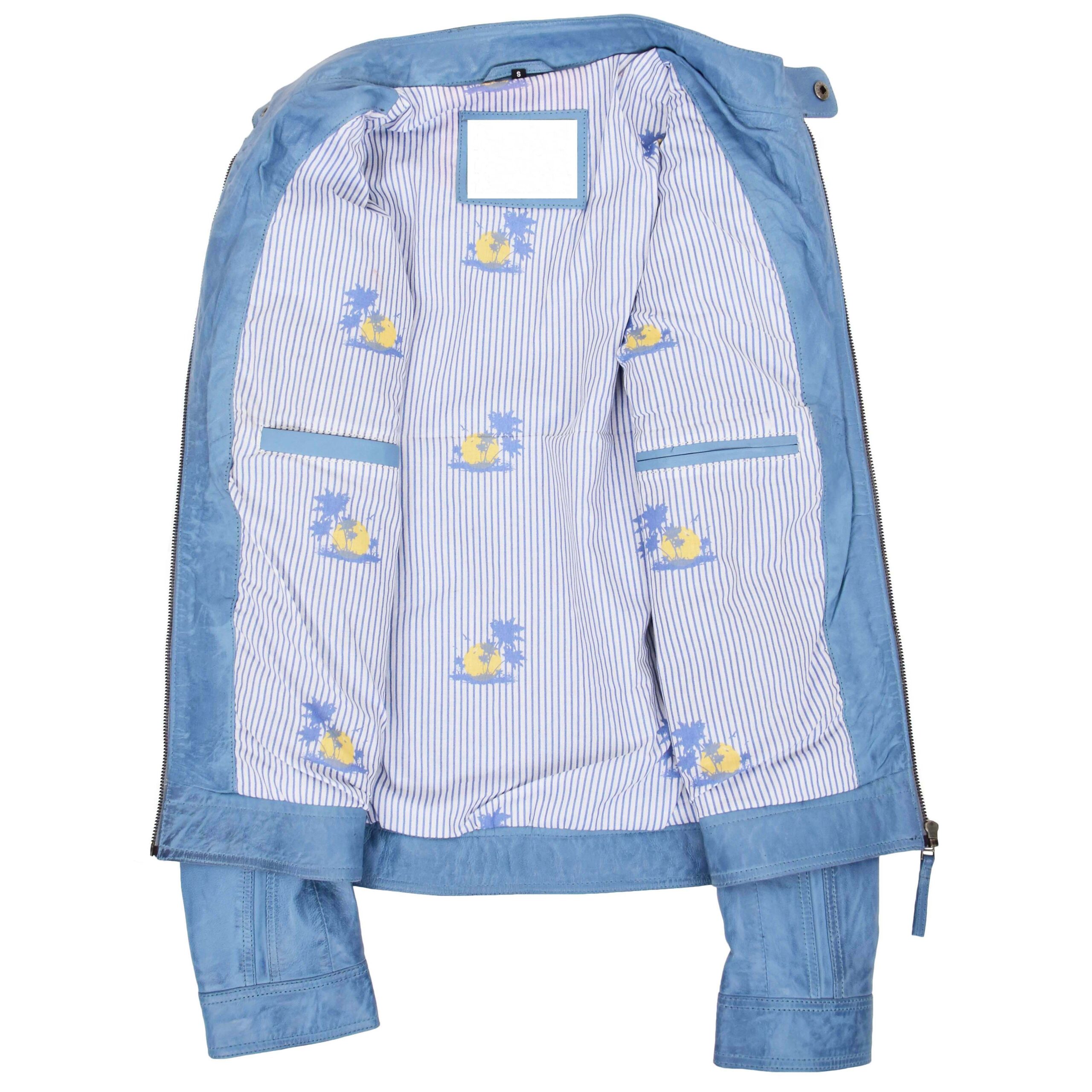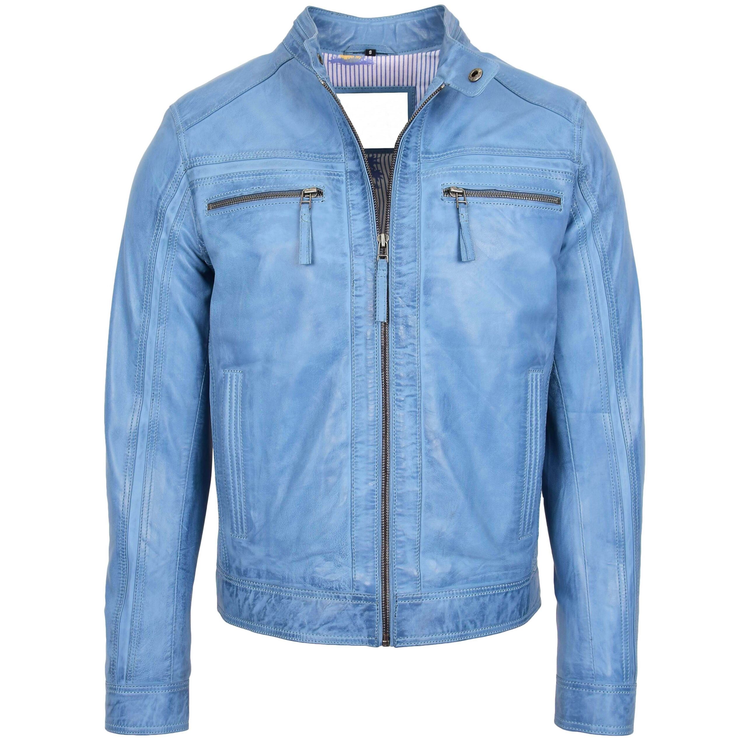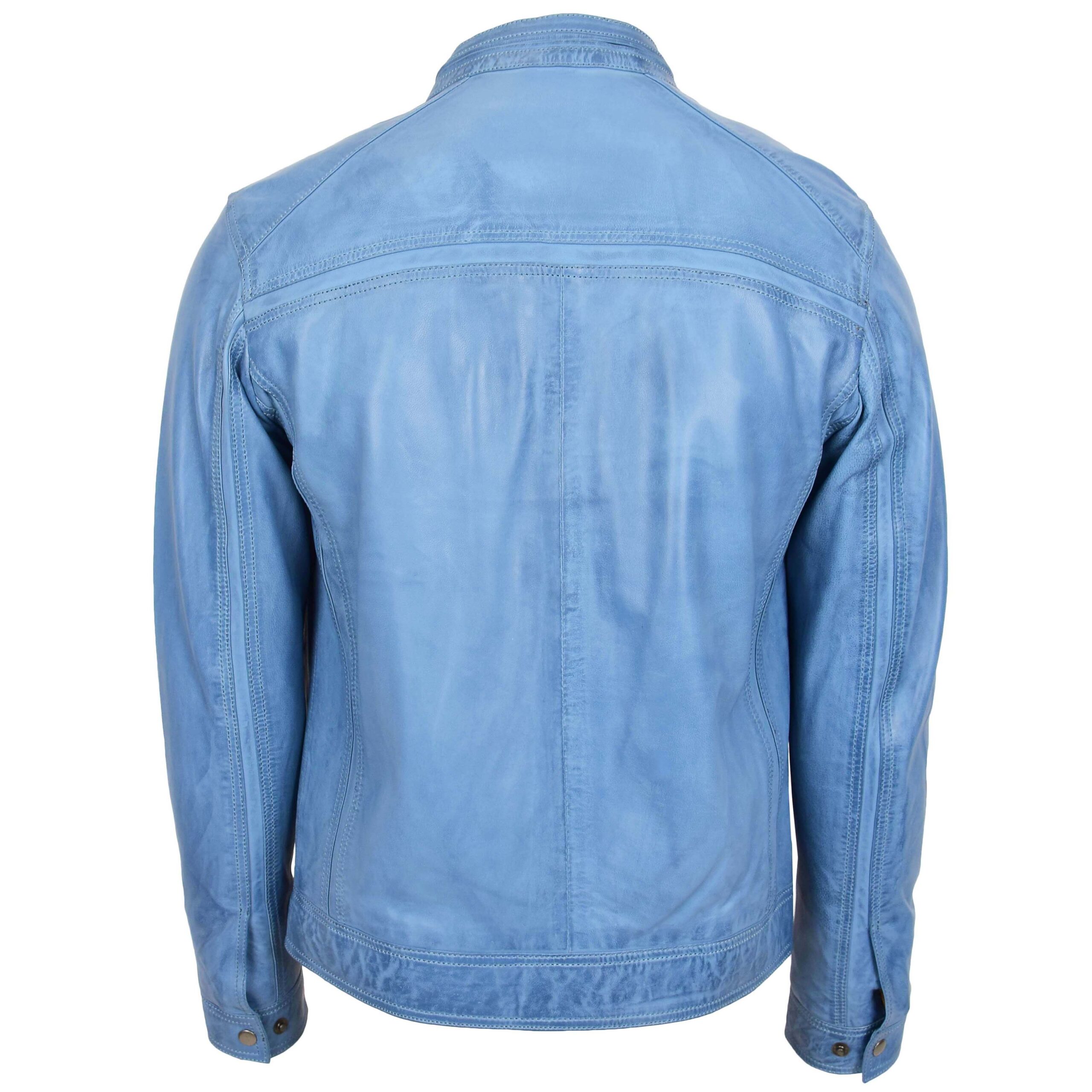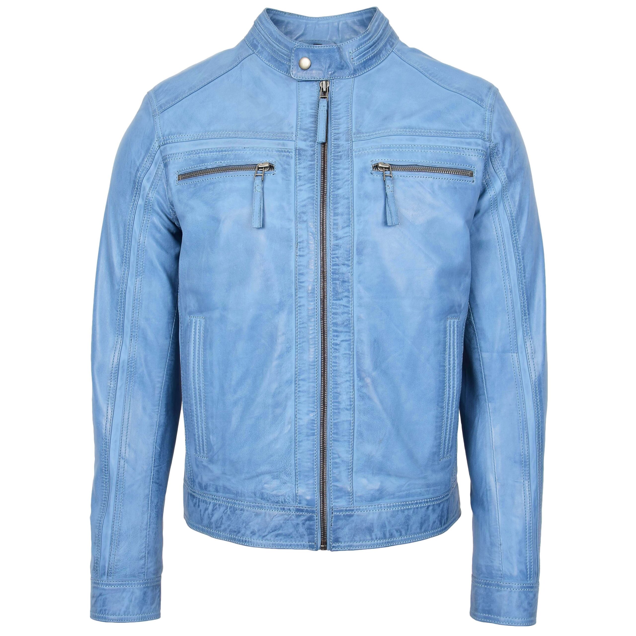 The Men’s Retro Style Zipped Biker Jacket Real Leather Soft Casual displays a sharp retro biker style. The light-blue tone looks fresh. The front shows two zipped chest pockets with matching pullers. The stand collar sits firm with a snap button. The long vertical seams give height to the look. Dedo Weather Works keeps the design neat and classic.