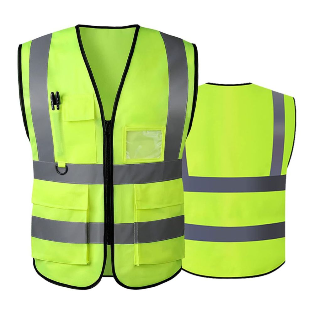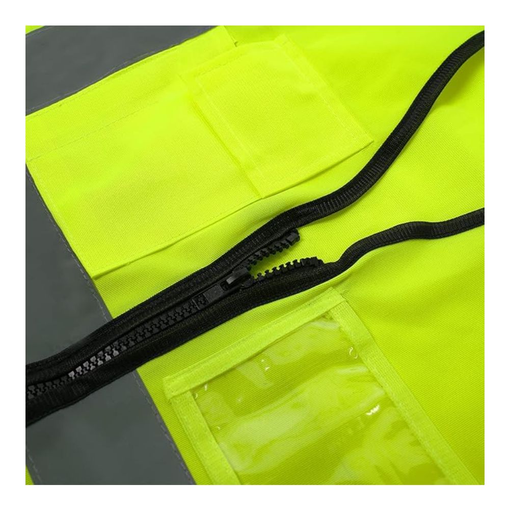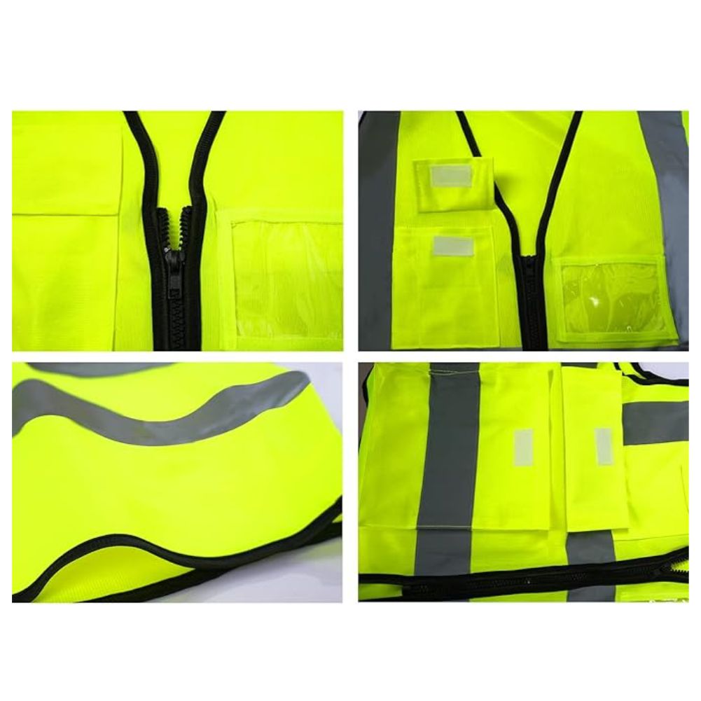 Reflective Safety Vest for Men & Women,High Visibility Class 2 Vest with 6 Pockets Meets ANSI Standards. Neon yellow with 2″ gray reflective tape front and back. Six pockets include ID window, phone flap, pen slot, and two big waist pockets plus D-ring. Smooth zipper. Unisex fit. ANSI/ISEA 107 Class 2 Type R compliant.