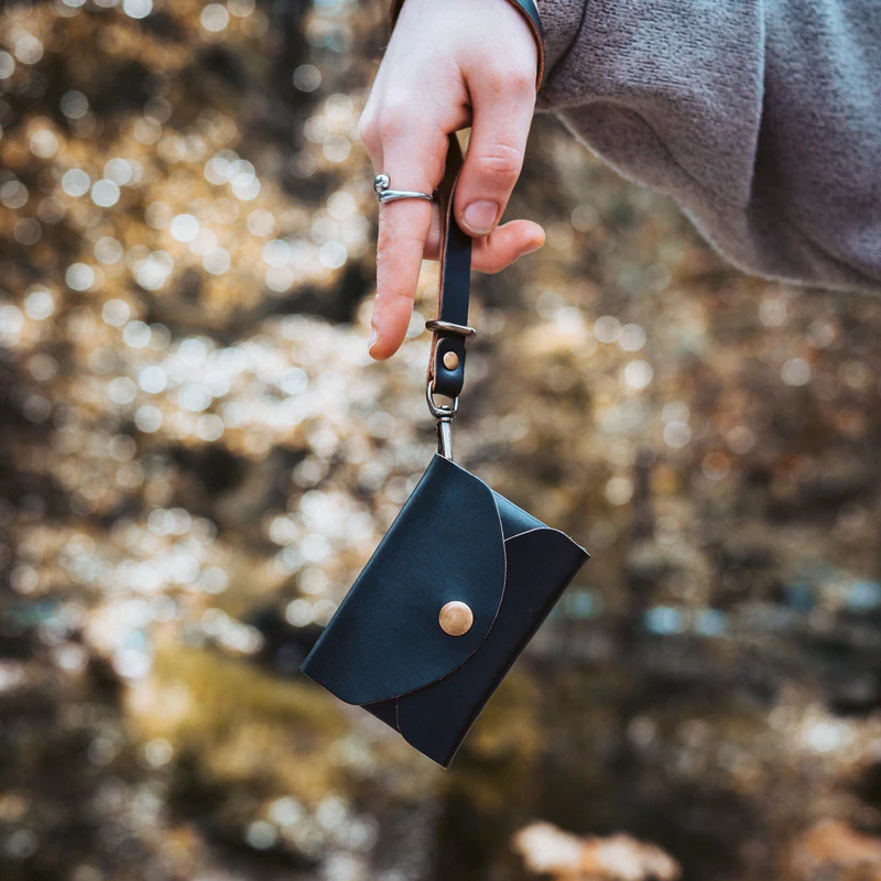 The Women Leather Envelope Pouch – Black by Dedo Leather Crafts combines style and practicality. Made from full-grain leather, this compact pouch holds 7-8 cards securely and is perfect for when you need just the essentials. With a detachable wristlet and a brass snap closure, it offers convenience and durability in one sleek design.